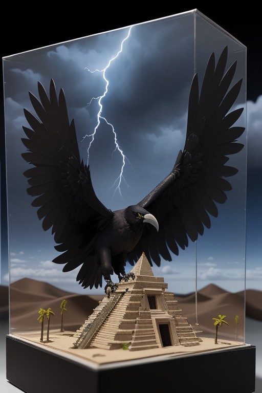 A highly detailed paper model cutout diorama depicting a Big black raven, thunder and lightning in black sky, behind him a desert and red space with a mayan piramid, the black raven is flying and open his wings, a plane hit by a storm flying in the distance. Intricate paper craft peephole box masterpiece.
