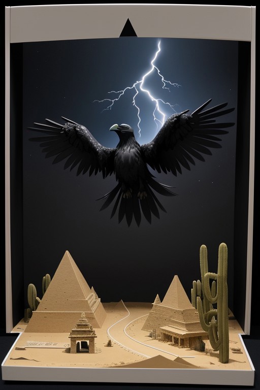 A highly detailed paper model cutout diorama depicting a Big black raven, thunder and lightning in black sky, behind him a desert and red space with a mayan piramid, the black raven is flying and open his wings, a plane hit by a storm flying in the distance. Intricate paper craft peephole box masterpiece.
