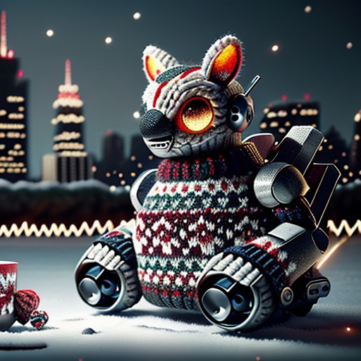 masterpiece, best quality, highly detailed, realistic, hyperreality, christmassweater, Massive robot catapulting presents, city skyline, robot wearing warm sweater, festive lights on robot, comfy sweater, <lora:world_christmassweater:0.8>,Cityscape background.
