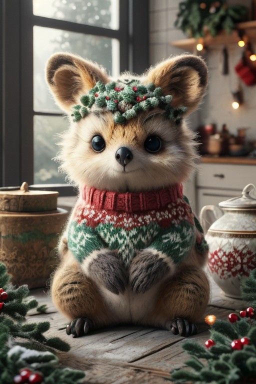 A whimsical quokka joyfully wearing a bright, festive christmassweater adorned with colorful patterns of snowflakes and holiday motifs. The quokka's expressive face beams with a cheerful smile, showcasing its endearing features. It is nestled among a backdrop of a lush, tropical setting, with vibrant green foliage and twinkling fairy lights strung between the trees. Soft, warm sunlight filters through the leaves, casting a magical glow over the scene. Surrounding the quokka are playful elements like scattered ornaments, holly leaves, and a few curious birds perched nearby, all contributing to the joyful holiday atmosphere.