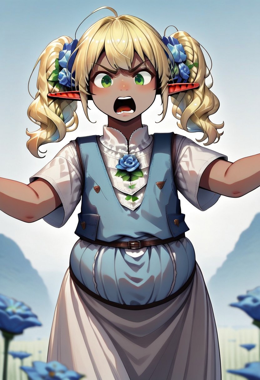 Yulie, 1 person, solo, pointy ears, dark skin, chubby, green eyes, blonde hair, twintail hair, wavy hair, blue flower hair ornaments, blue tunic, white dress, small nostrils, enraged expression, angry, open mouth, shouting, head back, hands raised, close up, face focus, ((3/4 view)):1.2, Dutch angle, organic cavern background, flower field, blue flowers, smooth walls, clean lines, highly detailed, high quality, best quality, rating: pg score_9, score_8_up