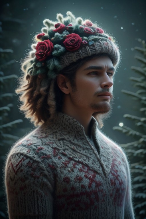outside, a man wearing a detailed, christmas themed christmassweater, forest, reds, green trees, flowers, wreath, garland, nighttime, glowing in the dark, christmas feel