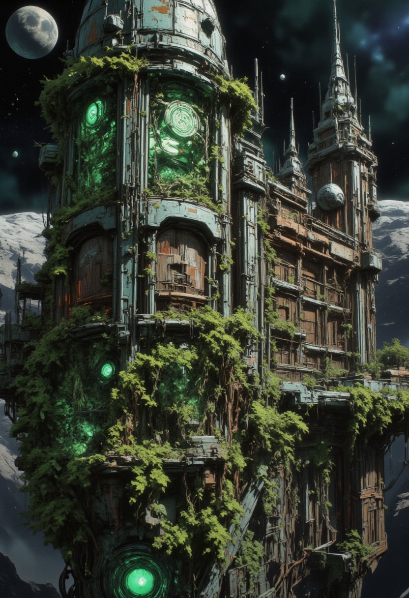 "Ultra-realistic sci-fi cinematic scene showcasing Earth's Moon transformed into a verdant fortress satellite. The moon’s surface is fortified with sleek metallic domes, robust support pylons, and sprawling networks of reinforced bunkers blending seamlessly into the dense, bioluminescent forest. These structures feature intricate lattices and angular reinforcements, layered with adaptive shielding panels for added defense. Massive, interconnected root-like conduits stretch from central power cores deep within the moon, supplying energy to essential systems like atmospheric generators and defense shields, their faint hum and glow illuminating the forested expanse. Orbiting docking stations hover above the surface, connected to the moon via sleek, carbon-fiber bridges and magnetic lifts, providing access to surrounding spacecraft. Through the grand, crystalline viewing towers, panoramic vistas of Earth and the Solar System unfold, visible through reinforced, transparent alloy windows that arc gracefully into the structure’s frame. Each defensive turret, embossed with mythic symbols and enhanced with automated targeting systems, merges both function and form. The structure emits a soft, otherworldly luminescence as the moon orbits, showcasing a unique blend of raw natural beauty and advanced technological architecture.”