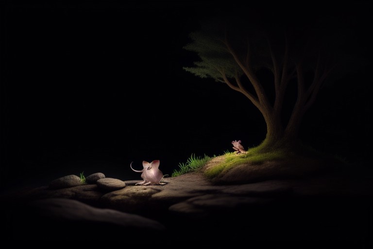 (black background, dimly lit, dark, night, trees, rocks, fantasy, bush),, (((black mice, ears, tail)))