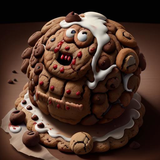 cookie monster ,eating gingerbread brain, drops of blood, horror scene,