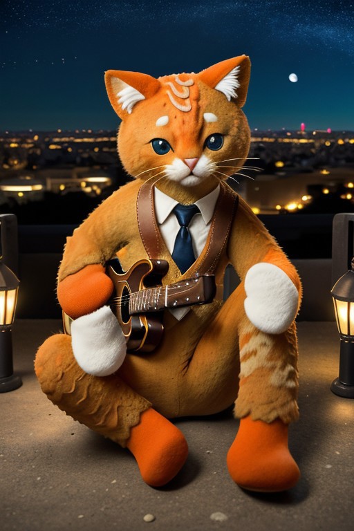 Expressiveh, TrailH,, score_9, score_8_up, score_7_up ,score_6_up, solo, (anthro lean body ),male, masterpiece,male, (best quality:1.1), ultra-detailed, high resolution, 8k, wearing ,Brown pants,Brown shirt , Brown -black suit,sitting on the floor,guitar , play the guitar ,sings while playing the guitar, Brown fedora , black necktie,feline creature , cat , yellow eyes,calico cat,spots ,round spots, 3 tones of spots color for all over the fur(Orange , White and black)detail face, detail eyes, solo,,detailed eyes, detailed face, detailed body,Slim body,long Tail , perfect eyes,detailed background, dynamic, immersive, intricate, <lora:S1_Dramatic_Lighting_v2:0.3>, anthro, no humans, furry, vibrant, ((full body)), zPDXL, OverallDetail, masterpiece, 8k, (highres:1.3), (detailed background,night,stars, yellow Moon, city,city view , street,street lamp, streetlight on,under a streetlight), concept art, digital art, realistic, 1boy, male,extreme wide shot, looking over shoulder,from the left,atmosphere,panoramic view,((extreme detail description)),Vivid Colors,view from above,jingerbread cookie form, cat jingerbread cookie,