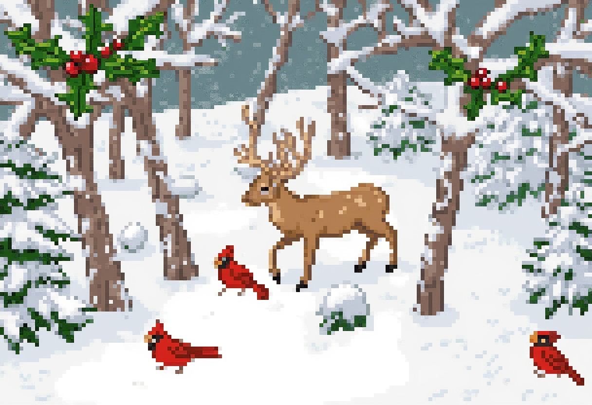 chr1stm4st1m3 a deer and cardinal birds in the snow, surrounded by trees covered in a blanket of snow. The trees are adorned with holly leaves and fruits, and the sky is visible in the background. <lora:christmas-time:0.8>