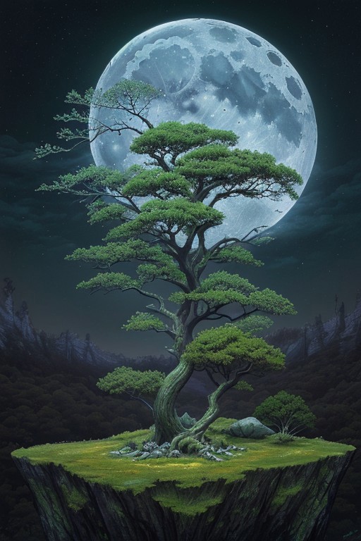 Large, gnarled, majestic, 2 trees, (detailed trunk texture: 1.2), silver bark, centered in frame, against moon , (cold moonlight: 1.1), light, beautiful night sky, landscape centered next to river, fantasy style, light tone, dramatic lighting, (dim light, slightly elevated perspective, photorealistic style, digital art, soft yellows, deep blacks, cold whites, warm reds, soft blues, green landscape; (detailed branches:1.1), slightly out of focus, moon dominating upper portion of image, fantasy tree, green hill, epic, oil painting
