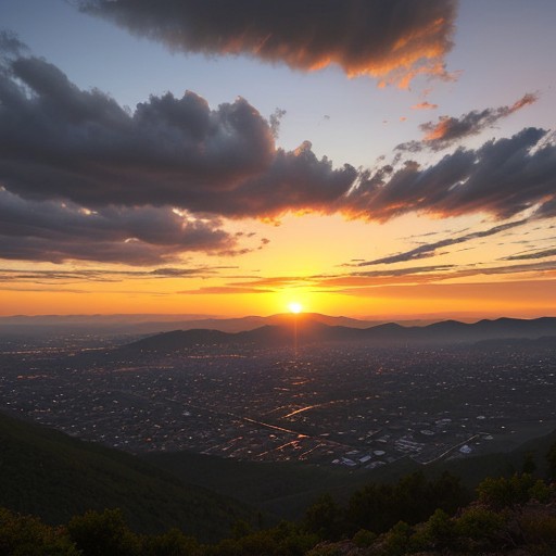 a realistic photograph of a sunset view from a mountain, the sun was set with a silhouette of a huge burning city