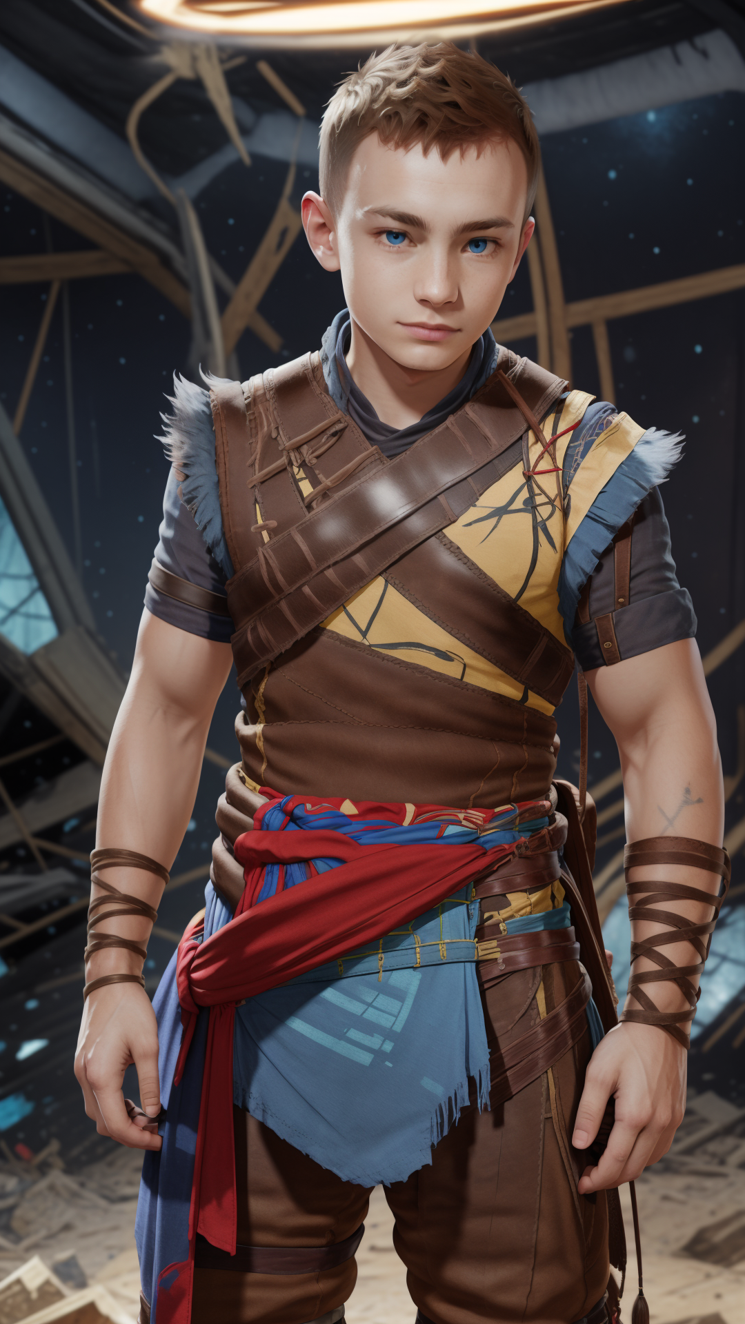 RAW photo, realistic, photorealistic, <lora:GoWRAtreusSD15:0.75>GoWRAtreus, boy, happy, Holding a flashlight, illuminating a dark room in a ancient spaceship wreckage location. Blue eyes and short brown buzzcut. GoWRAtreus is wearing a (yellow:0.5) tunic with leather details. Belts and straps crossing his body. (His waistcloth is red and blue:1.4). GoWRAtreus is wearing brown leather boots. His right arm is bare and has a tattoo.
