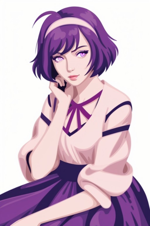 1girl, solo, hairband, short hair, purple hair, upper body, simple background, white background, purple eyes, purple hairband, :<, blush, looking at viewer, pink eyes, red eyes, shirt, jewelry, alternate costume, dress,, zPDXL3, PnyCmicXLPOS, detailxl, (lineless, vector art:1.5), sitting
