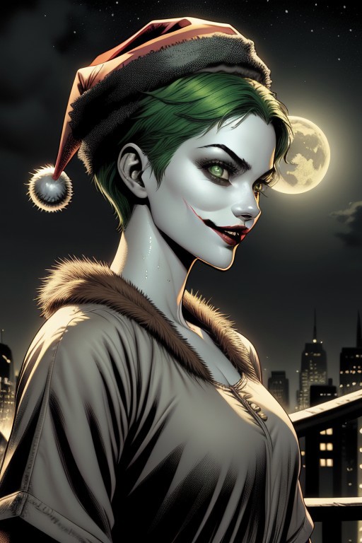 <lora:Jokerette-10:1> masterpiece, best quality, full figure picture, (detailed beautiful face, detail skin texture, ultra-detailed body:1.1), Jokerette, female Joker, a woman, green hair:1.3, <lora:TomboyBuzzcut1-2-0805:0.2>, very short hair, green short hair, green eyes:1.2, dressed in a santa outfit, <lora:Sexy Santa Outfit By Stable Yogi:1>, wearing a santa hat, fur-lined bodice, slender, skinny, large breasts, Christmas. Moon. American Comic book style, DC Comics, night scene, intricate background, atmospheric scene, feminine+, shiny wet skin, pale white albino skin::2, stark white skin, wide evil smile::1.1, looking at viewer, modelshoot style, photo of beautiful artwork, High Detail, Sharp focus, dramatic+, Intricate, beautiful, otherworldly, mysterious, highly detailed
