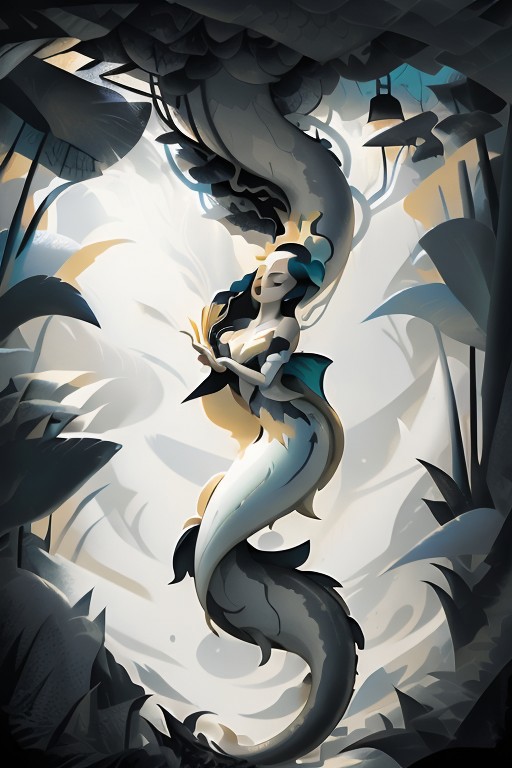 Poster, art by Felix Kelly, Fractal, extreme wide shot of a mermaid in a multicolored lush underwater jungle with dynamic lighting, wavy spread out multicolored hair, glowing hair, multicolored mermaid tail with glowing gold details, dappled light, vibrant colors, Screen print, Rembrandt lighting, anaglyph filter <lora:post00d-000010:1>