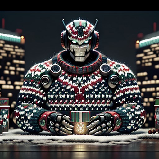 masterpiece, best quality, highly detailed, realistic, hyperreality, christmassweater, Massive robot catapulting presents, city skyline, robot wearing warm sweater, festive lights on robot, comfy sweater, <lora:world_christmassweater:0.8>,Cityscape background.