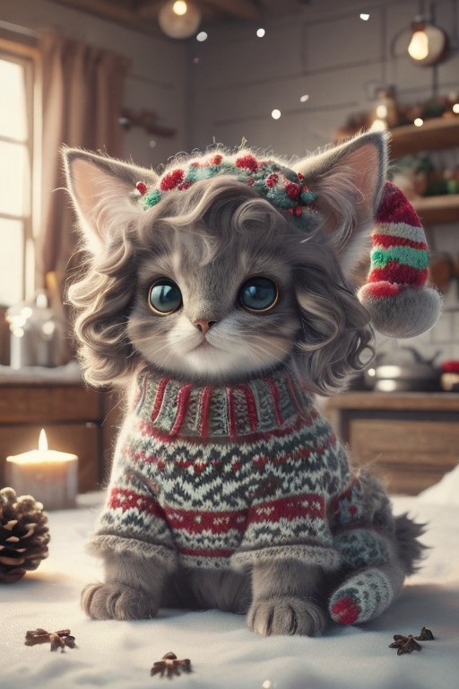 An adorable unicorn kitten wearing a festive christmassweater, nestled in a cozy winter setting. The kitten features a fluffy, pastel-colored coat with a shimmering, spiraled horn atop its head, adorned with tiny ornaments. Its oversized, expressive eyes sparkle with joy as it playfully paws at a snow-covered ground sprinkled with colorful candy canes and twinkling fairy lights. The background showcases a charming snow-laden landscape, complete with a quaint cabin lit warmly from within, and softly falling snowflakes that add to the enchanting holiday atmosphere.