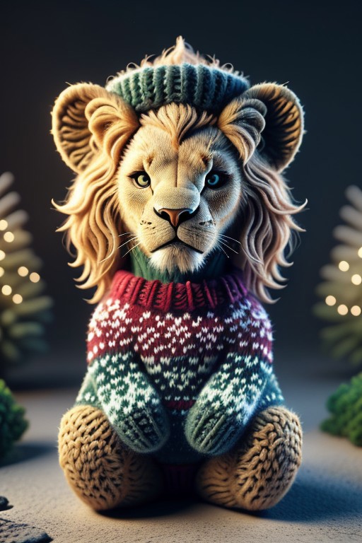 a cute Lion in the garden, in christmassweater, highres image scan, high-definition, cute 3d, detailed, masterpiece, colorful, vibrant, beautiful