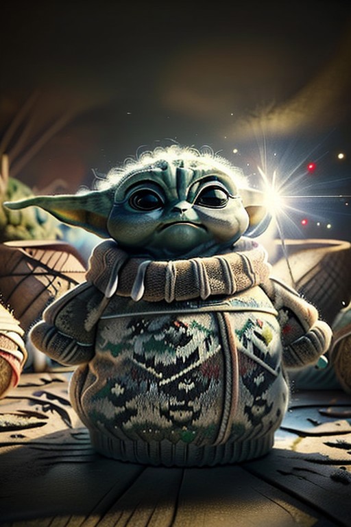 (masterpiece, best quality:1.8), christmassweater, christmas, Grogu "Baby Yoda", Star Wars, no humans, in a swamp planet, alone, sweet face, wear a christmas sweater in red, white and green, with an image of mandalorian stamped, wool sweater , firing a laser pistol, <lora:world_christmassweater:1>