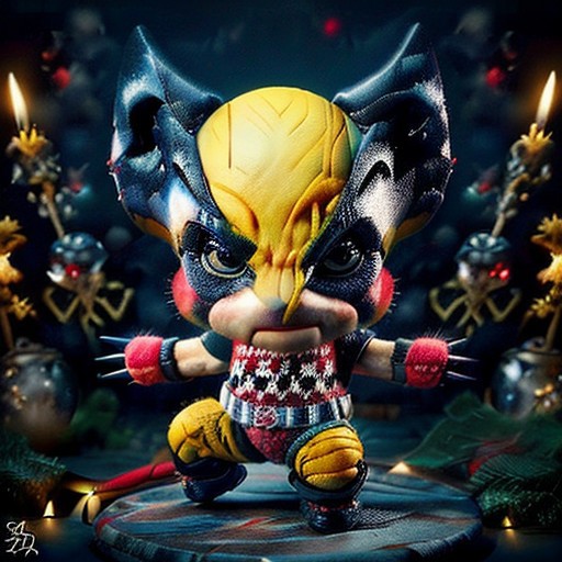 christmassweater,Highly detailed Dynamic shot of chibi wolverine costume, high quality, beautiful masterpiece, fantasy creature, kawaii, digital art, glowing sparkles,