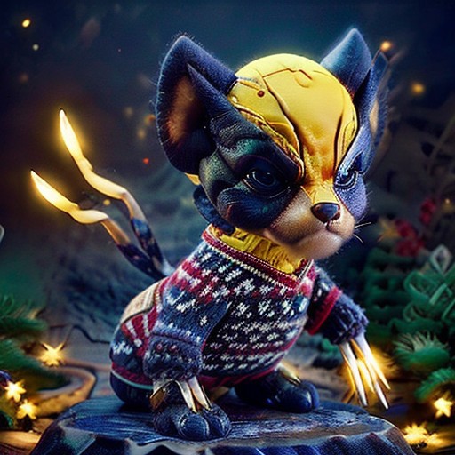 christmassweater,Highly detailed Dynamic shot of chibi wolverine costume, high quality, beautiful masterpiece, fantasy creature, kawaii, digital art, glowing sparkles,