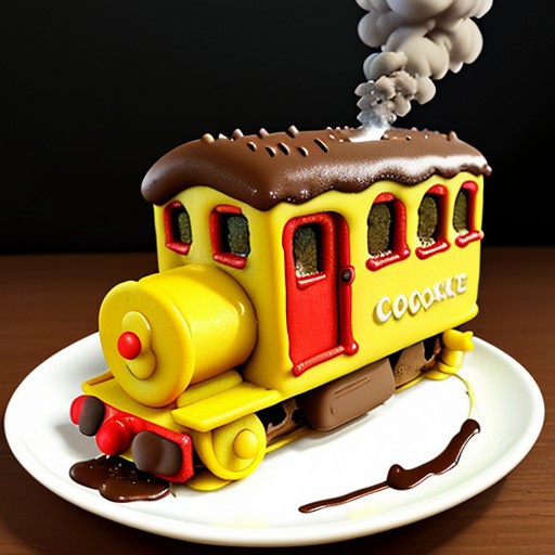 Gingerbread_Man, food, cookie, food focus, no humans, a train made out of cookies emitting chocolate smoke. The background is a cookie mountain landscape