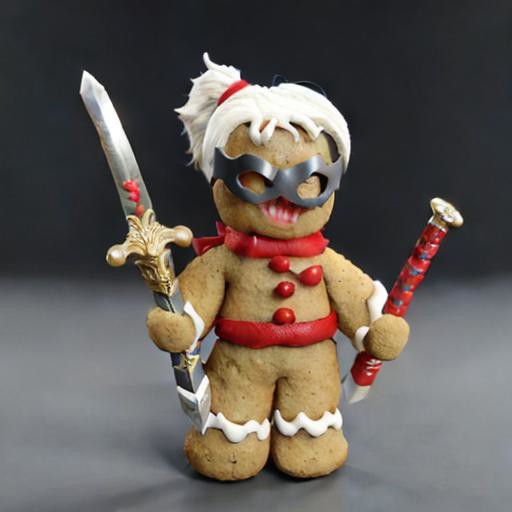 Gingerbread_Man, food, cookie, food focus, no humans, haunting, weapon, cookie sword, solo, cookie armor, 1boy, male focus, holding, dual wielding, samurai, helmet, katana, horns, holding weapon, japanese armor, holding sword, light blue skin, blue eyes, full body, fighting stance, snow background, glowing, glowing eyes, sheath, standing, gloves, teeth, japanese clothes, white hair, shoulder armor, demon, looking at viewer, mask, ponytail, fangs, sharp teeth