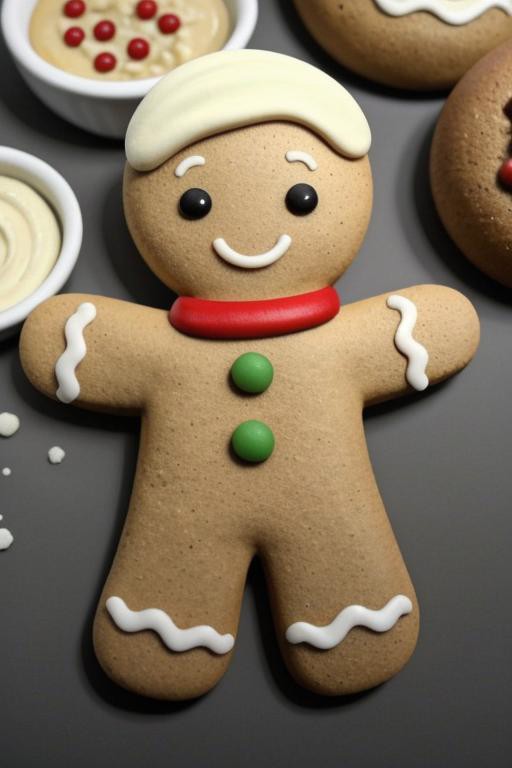 ((masterpiece,best quality)), Gingerbread_Man, food, cookie, food focus, no humans, a human sized gingerbread man baking regular gingerbread cookies on a cookie sheet next to a bowl of cake batter, kitchen background, smile, full body, scarf, red scarf, gumdrop buttons