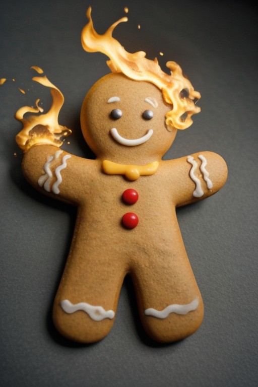 Gingerbread_Man, food, cookie, food focus, no humans, on fire, fiery world, fantasy, burning