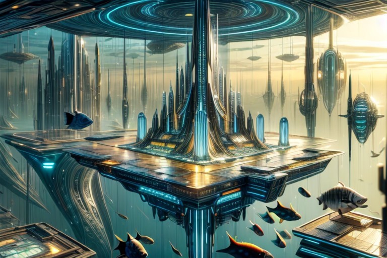 masterpiece, absurdres, awesome quality, hyper detailed, DonMX3n0T3ch, futuristic, scifi, tech, future city, a fish, underwater, sinked city, water particles