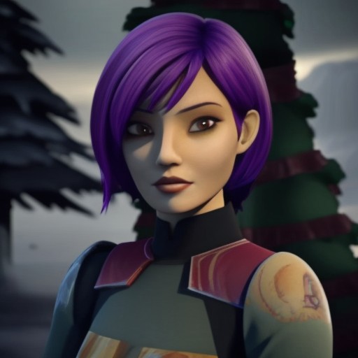 Sabina Wren in a green sweater side-swept hairstyle purpure hair in winter forest with Christmas tree