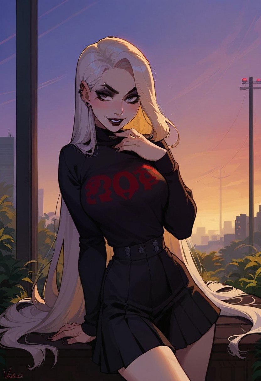 score_9, score_8_up, score_7_up, score_6_up, pretty woman, 21 year old, 1girl, very pale skin, white skin, goth girl, emo, eyeliner, eyeshadow, white hair, long hair, straight hair, happy, smile, pretty face, long hair, long sleeves, black clothing, shirt, skirt, sexy pose, public, downtown city