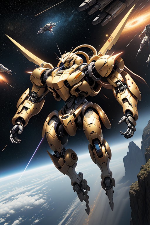 zzmckzz, mecha armor, gold color mecha armor theme, (flying toward the viewer:1.20), armaments equipped in the armor, (right hand holding beam rifle:1.20), space in the background:0.8