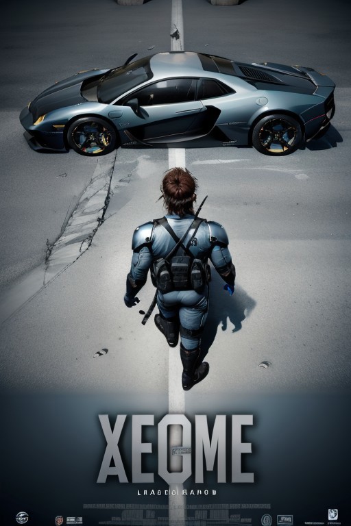 (masterpiece, best quality:1.2), akiraposter, from above, from behind, male focus, 1boy, solid snake, walking, blue bodysuit, gloves, headband, ground vehicle, black lamborghini, Lamborghini Murciélago, <lora:solidsnake-nvwls-v1-final:0.9>, <lora:concept_akiraposter-11:1>