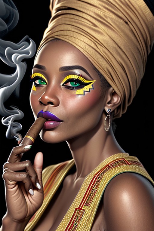 highly detailed african woman 45 years hold,small wrinkles,colorful makeup,looking at viewer,green eyes,intricate design details,rays traced shadows,smokes a lit Cuban cigar,which emits a lot of smoke,