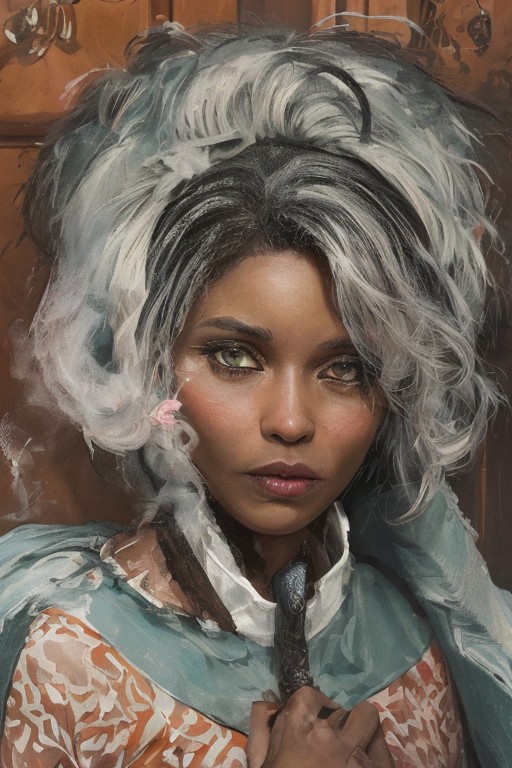 highly detailed african woman 45 years hold,small wrinkles,colorful makeup,looking at viewer,green eyes,intricate design details,rays traced shadows,smokes a lit Cuban cigar,which emits a lot of smoke,