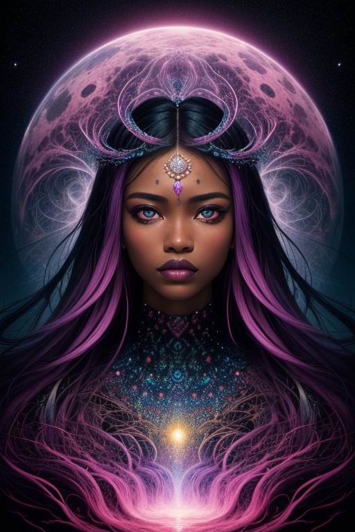 (beautiful goddess, dark skin, Stylized:1.2), black hair with colored streaks, multicolored hair, pink hair, purple hair, (masterpiece:1.2), (A uniquely beautiful female dressed in high fashion attire that resembles the patterns found in nature, set against a composition that merges fractal patterns with dreamlike landscapes:1.1), (The subject is best lit so she can be seen clearly, The background features a surreal dreamscape with floating islands and cascading waterfalls:1.1), (hyperdetailed:1.1), (intricate details:1.0), (Refined details:1.1), (best quality:1.1), (very stylish detailed modern haircut, mesmerizing detailed radiant face, mesmerizing detailed beautiful eyes:1.2), highly detailed textures, random colors, awe-inspiring, dark skin tone, cosmic background
