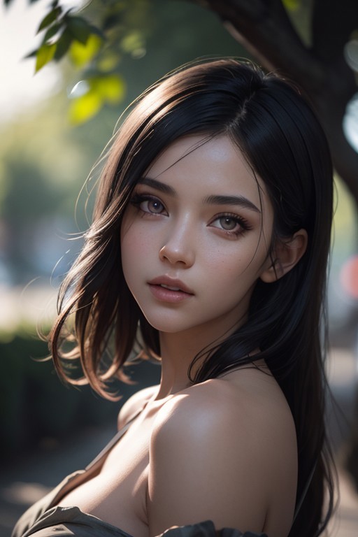 1 girl, bare shoulder, masterpiece, best quality, high resolution, 8K, HDR, bloom, sun light, raytracing, detailed shadows, intricate tree shadow, bokeh, depth of field, film photography, film grain, glare, (wind:0.8), detailed hair, beautiful face, beautiful girl, ultra detailed eyes, cinematic lighting, (hyperdetailed:1.15), outdoors