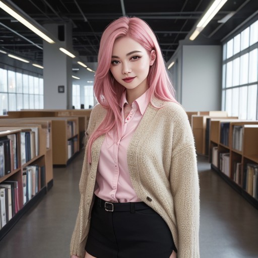 Create an ultra-detailed, photo-realistic (1.3) 8k wallpaper depicting a stunning, young dragon girl wearing a business suit and cross-laced clothes with a collared shirt open to reveal a miniskirt underneath. Her hair is a vibrant pink color with medium length (1.3) and short bangs, featuring the novafrogstyle floating strands. Her eyes are incredibly detailed, with long eyelashes framing her gaze as she looks directly at the viewer with a light smile. Her face is mature yet youthful, with a beautiful, delicate nose and subtle definition on her features. She stands in an office setting with a detailed, futuristic background, surrounded by open cardigan and unbuttoned shirt revealing black thigh-highs underneath. The floor-to-ceiling shelves are stocked with various books and devices, while the walls feature sleek metallic panels and translucent screens. In the foreground, a small desk holds a peculiar, glowing orb emitting soft light that casts a warm glow on her face.