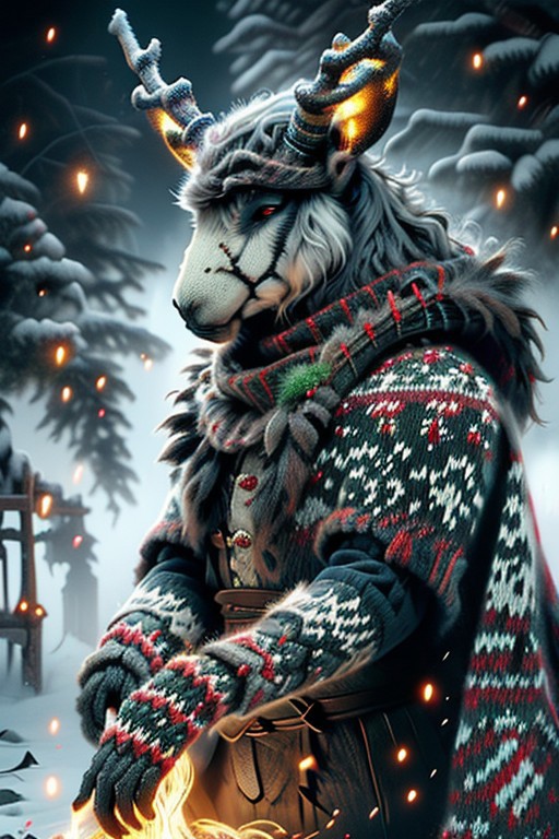 (christmassweater:1.3), Highly detailed Dynamic shot of red_eyes, hat, 1boy,( anthro reindeer:1.2), holding, jewelry, standing, weapon, male_focus, sword, pants, coat, torn_clothes, fur_trim, black_headwear, mask, capelet, glowing, moon, black_pants, fire, gauntlets, gem, glowing_eyes, black_coat, top_hat, (anthropomorphic reindeer:1.1), furry, high quality, beautiful masterpiece, fantasy, digital art