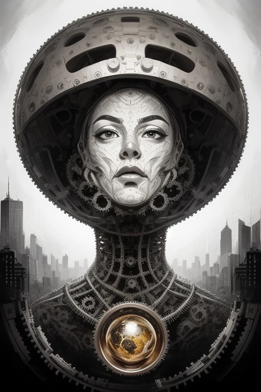 An abstract painting of a majestic mechanical face that looms over the urban skyline like a colossal sculpture. The face, intricately designed with gears and metallic features, captures the essence of both human and robotic artistry, reflecting the duality of creation., cubism, expressionism, Chiaroscuro, style Alexander Jansson, style Picasso, assured features, clean looks, expressive faces, inventiveness, originality, detailed, ambitious creation, clear and bright colors, artistic rendering, sphere and maze