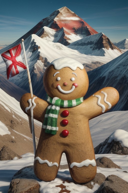 score_9, score_8_up, score_7_up, score_6_up, ((masterpiece,best quality)), absurdres, Gingerbread_Man, food, cookie, food focus, looking at viewer, mountain winter clothes, gloves, planting flag at the top of mount everest