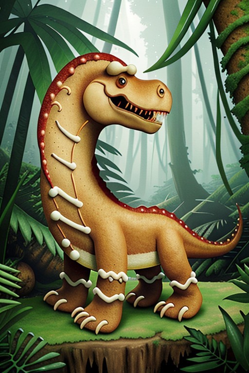 hyper-realistic, gingerbread T-Rex, gingerbread primeval jungle