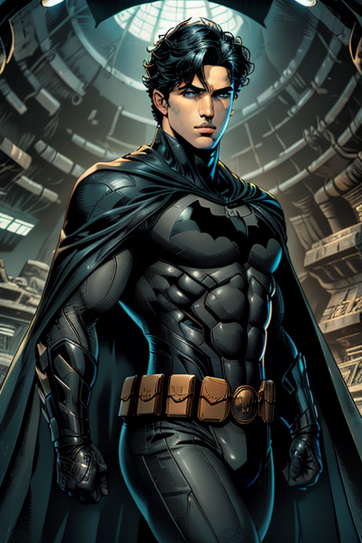 <lora:Batman-IO-10:1> ((masterpiece)), (best quality), comic book style, full figure picture of Bruce Wayne in a Batsuit, in the Batcave, long cape, detailed, masculine, detailed eyes, HDR, artistic, photorealistic