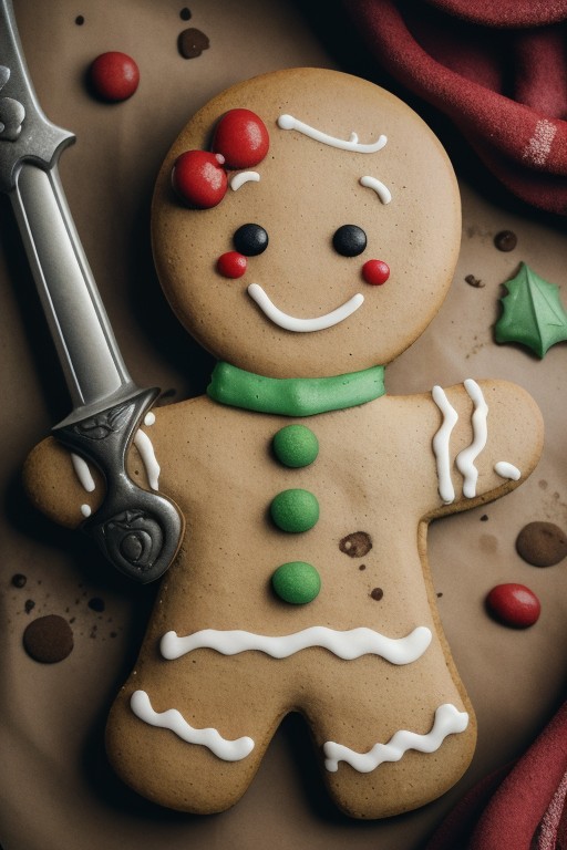 (score_9,score_8_up,score_7_up), (masterpiece, 8K, high quality, highres, ultra-detailed, absurdres, best quality, detailed), sidelighting, Gingerbread_Man, food, cookie, food focus, no humans, kitchen, gingerbread man holding a sword, wearing armor made out of cookies,