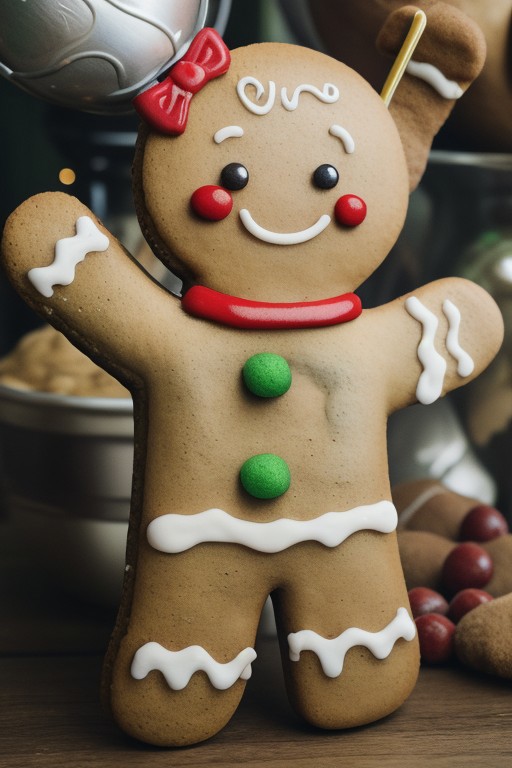 (score_9,score_8_up,score_7_up), (masterpiece, 8K, high quality, highres, ultra-detailed, absurdres, best quality, detailed), sidelighting, Gingerbread_Man, food, cookie, food focus, no humans, kitchen, gingerbread man holding a sword, wearing armor made out of cookies,
