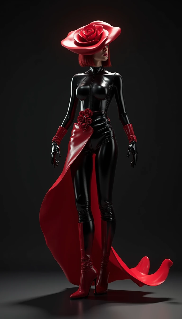 3d digital art performance professional full-figure fashion-photography from front and from back view of an unreal flawless female model with short red hair, wearing a futuristic costume of a rosebud with a wide rimmed crimson hat shaping a rosebud. the model is wearing a shiny black faux leather long-sleeved pantsuit with similar black gloves and vibrant red high heeled tall boots out of faux leather and a crimson coloured, long overskirt with small rosebuds at the bottom and a wide rimmed hat shaping a large rosebud. she is posing gracefully with arms and legs. the backdrop is dark with cinematic lighting.