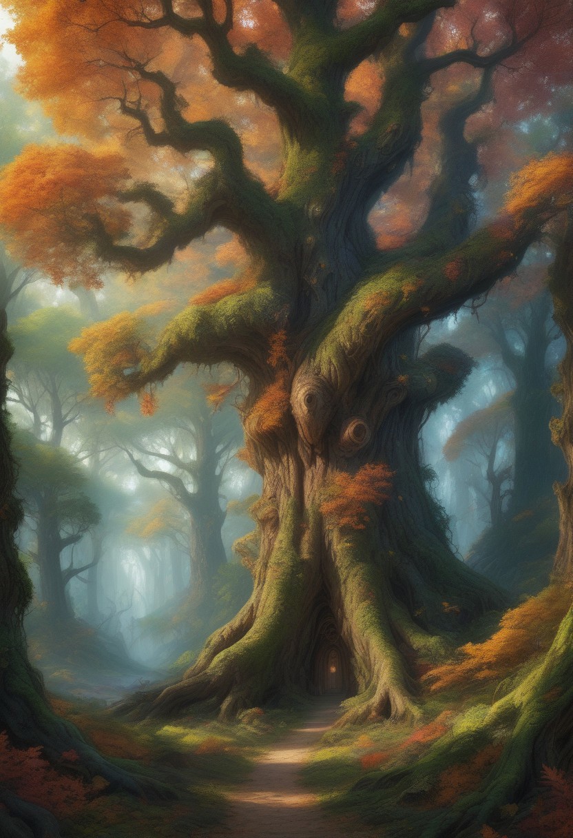 fantasy forest, an expansive ancient forest, featuring a single towering oak, majestic leaf canopy, diverse wildlife, a variety of flora, and a feeling of grandeur, fall coloring,