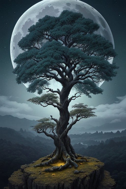 Large, gnarled, majestic, 5 trees, (detailed trunk texture: 1.2), ebony bark, centered in frame, against moon , (cold moonlight: 1.3), light, beautiful night sky, landscape centered next to river, fantasy style, light tone, dramatic lighting, (dim light, slightly elevated perspective, photorealistic style, digital art, soft yellows, deep blacks, cold whites, warm reds, soft blues, green landscape; (detailed branches:1.1), slightly out of focus, moon dominating upper portion of image, fantasy tree, green hill, epic, oil painting, epiCPhoto