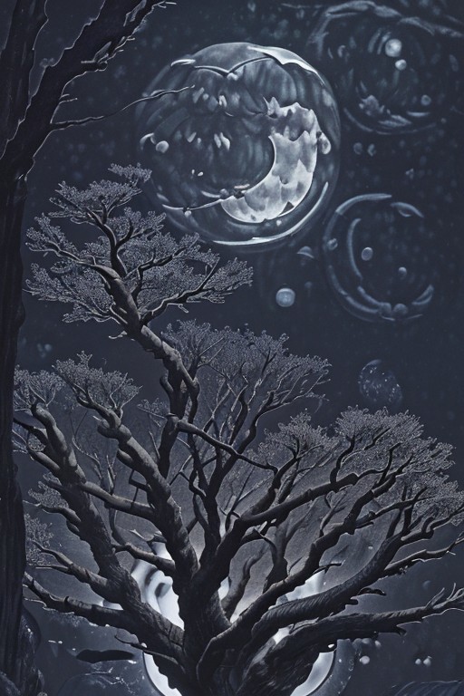 Large, gnarled, majestic, 5 trees, (detailed trunk texture: 1.2), ebony bark, centered in frame, against moon , (cold moonlight: 2.1), light, beautiful night sky, landscape centered next to river, fantasy style, light tone, dramatic lighting, (dim light, slightly elevated perspective, photorealistic style, digital art, soft yellows, deep blacks, cold whites, warm reds, soft blues, green landscape; (detailed branches:1.1), slightly out of focus, moon dominating upper portion of image, fantasy tree, green hill, epic, oil painting