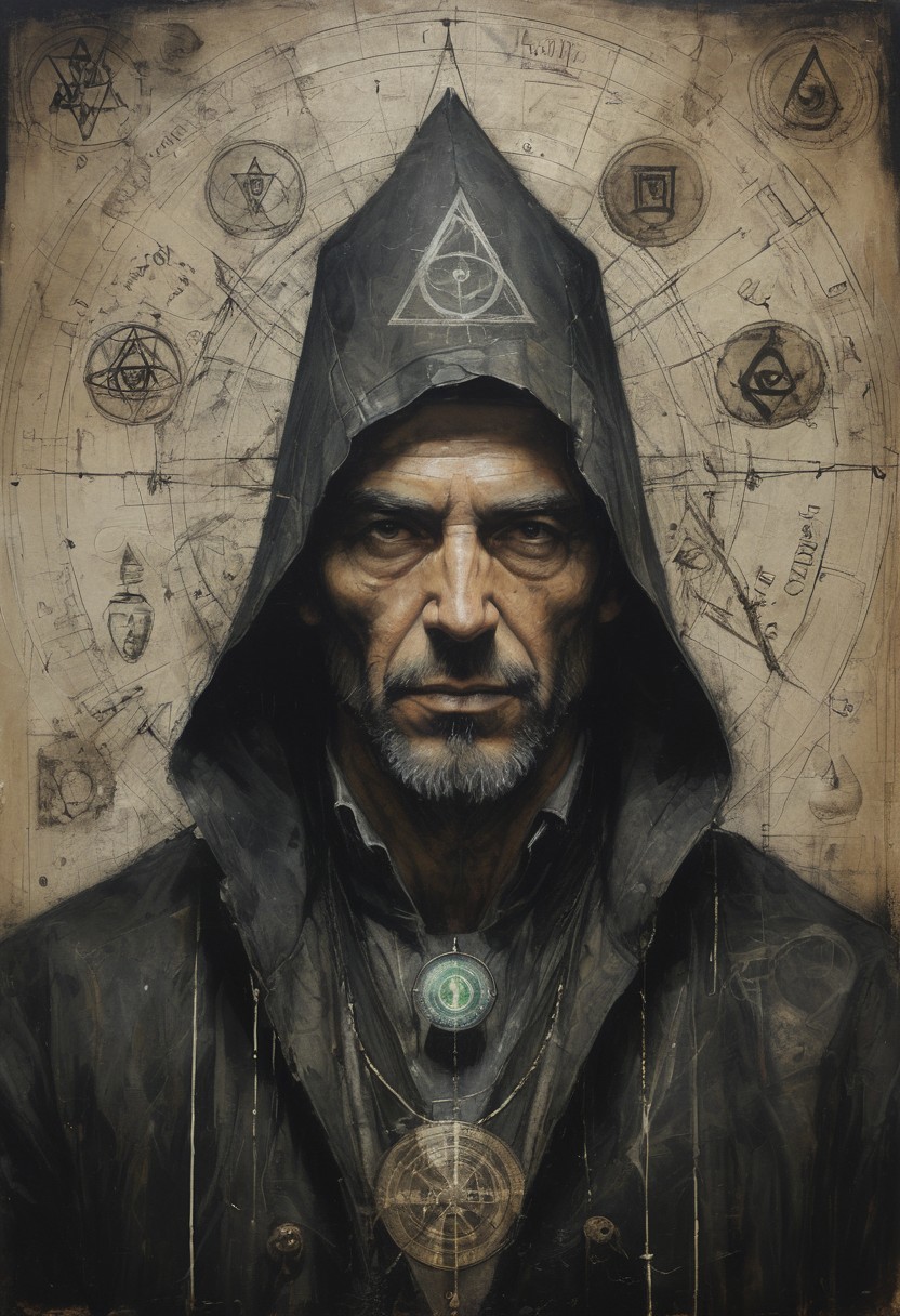 highly detailed art by Guy Denning, Surreal Alchemist: A male character portrait of a master alchemist, with face surrounded by alchemical symbols,,