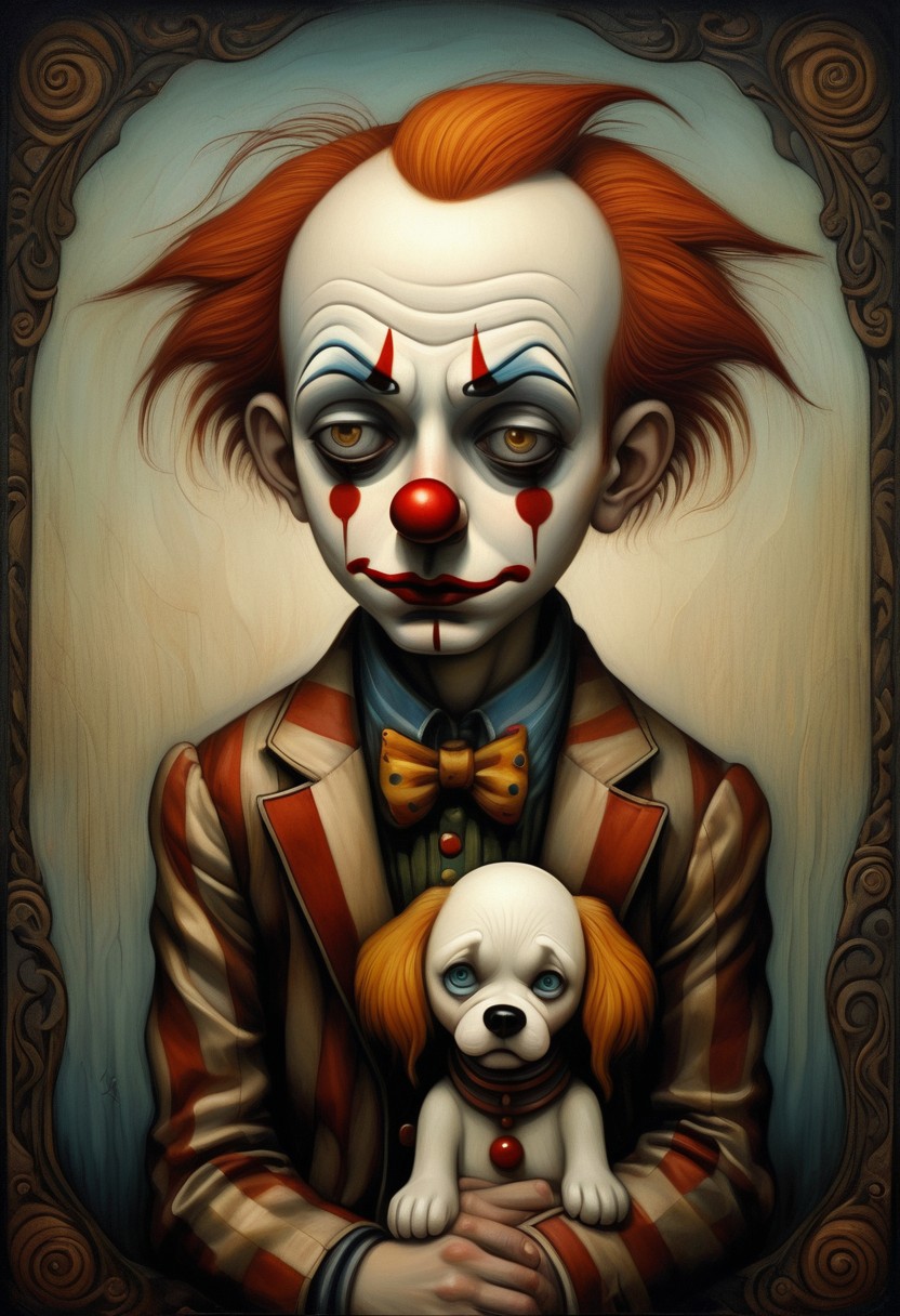 Benjamin Lacombe art of sad clown-boy with his dog, detailed face, perfect detailed eyes, detailed background, intricate, Exquisite details and textures, warm lighting